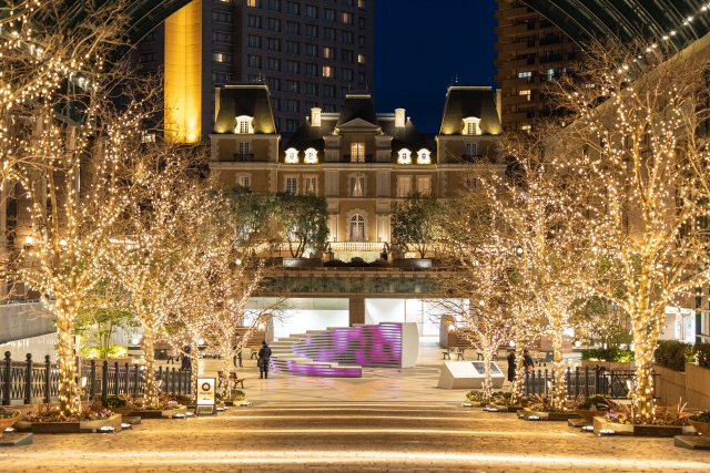 東京・恵比寿のロマンチックな夜は、街灯とともに都市のシルエットが灯り始める時間が特別です。