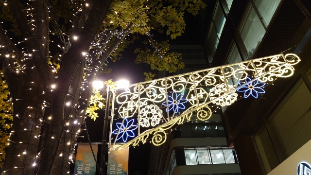 ビル壁面とイルミの色が美しく調和し、SNS投稿でも人気。人通りは多いので写真は早めの時間帯が◎。