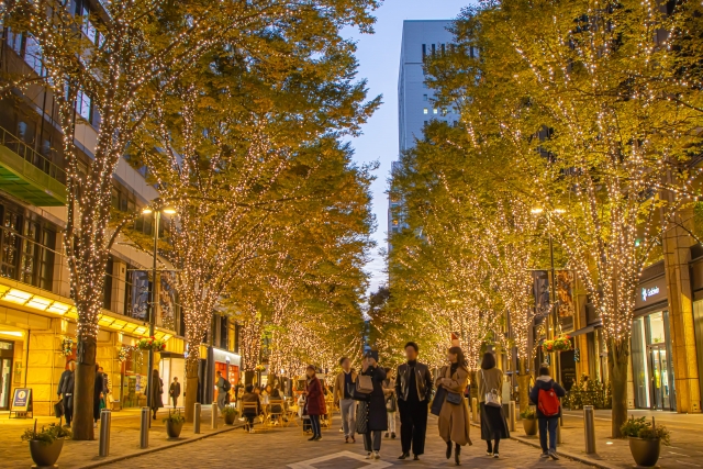 冬の定番イベントとして人気の「丸の内イルミネーション」。東京駅周辺の街路樹がシャンパンゴールドに染まり、仕事帰りの人から観光客まで多くの人が訪れます。